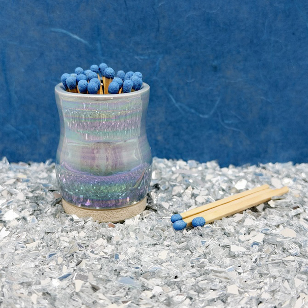 Two ways to strike, one striking design. Strike your match on the plate underneath or go rogue with strike-anywhere matches on the unglazed base. Approximately 2.13" high x 1.25" diameter, slight variations show the artist's hand. Color-coordinated safety matches and replacement striking plate included.