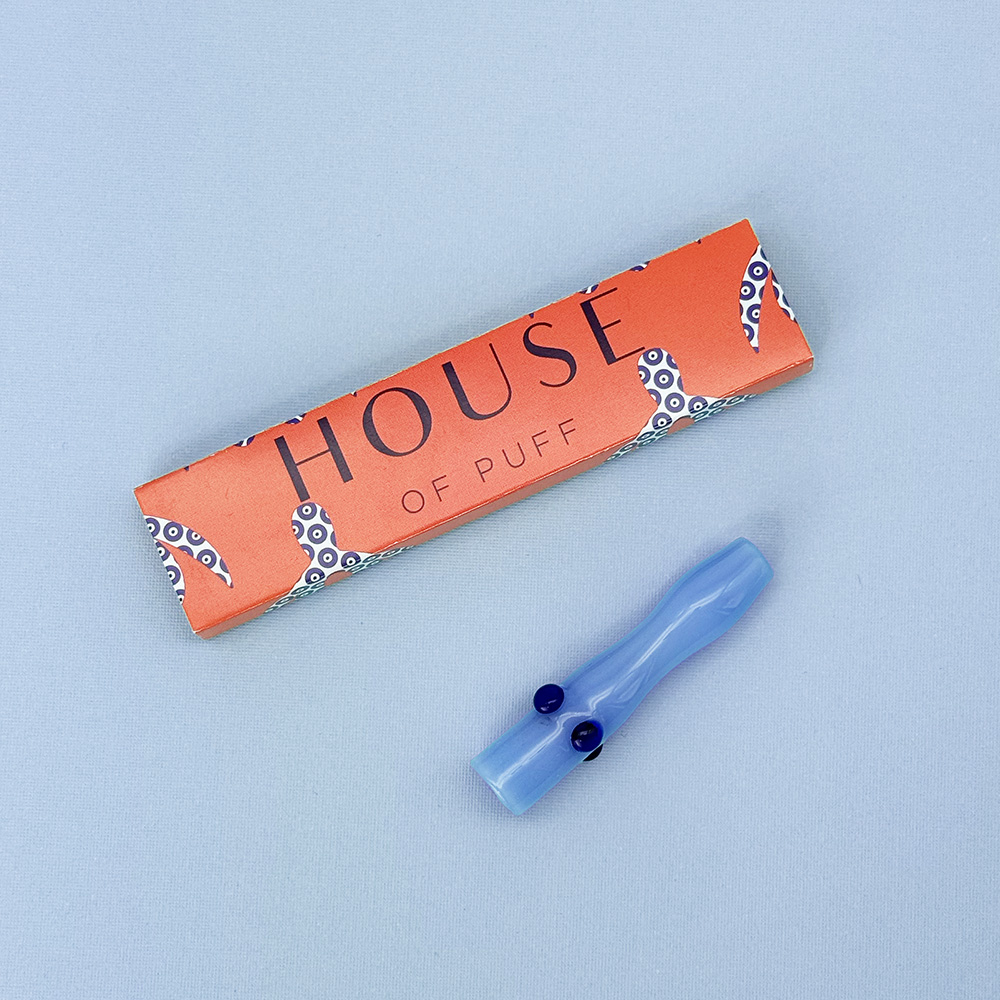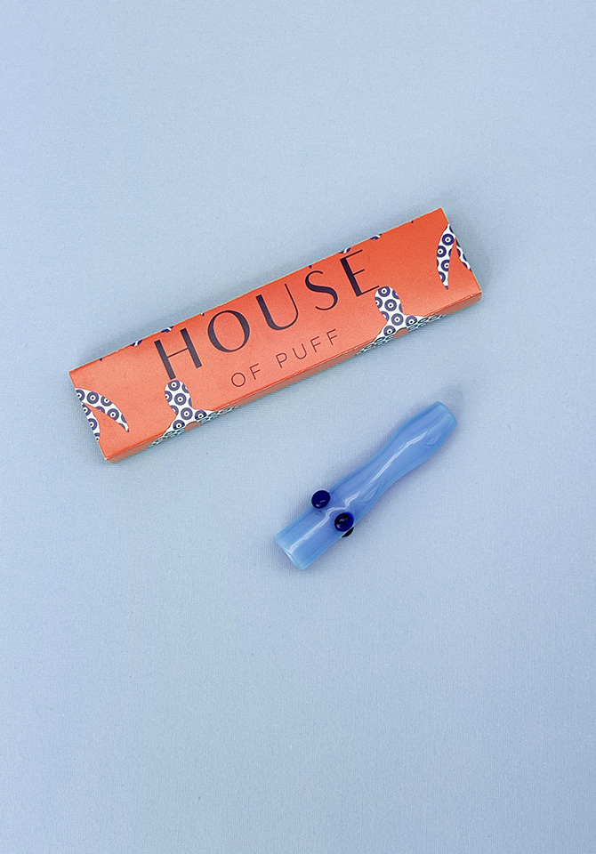 The Soho Duo is a cornflower blue glass joint holder paired with three packs of Sophia Wallace Collection Rolling Papers. A functional work of art that makes every part of the joint experience feel more curated.