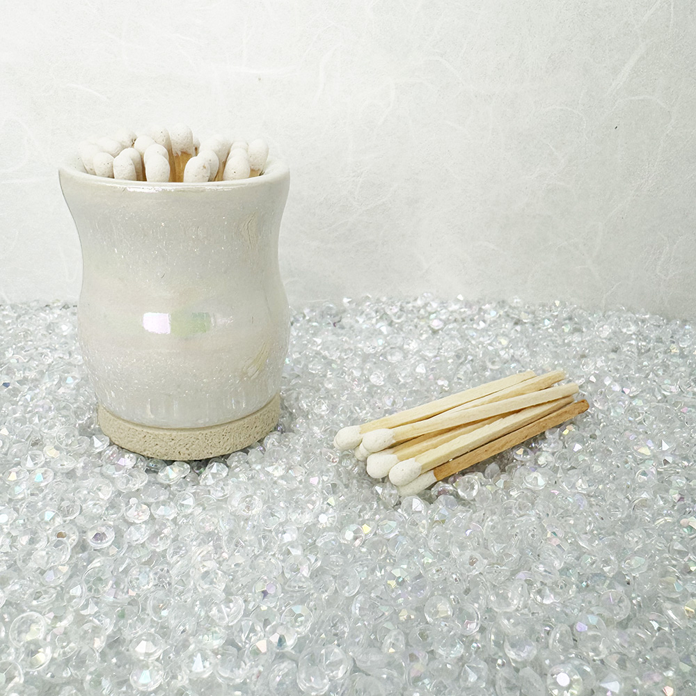 Two ways to strike, one striking design. Strike your match on the plate underneath or go rogue with strike-anywhere matches on the unglazed base. Approximately 2.13" high x 1.25" diameter, slight variations show the artist's hand. Color-coordinated safety matches and replacement striking plate included.